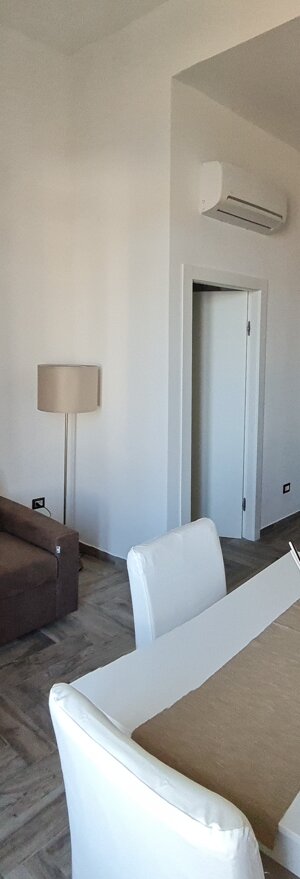 Appartamento mq. 57 vista mare, infissi nuovi vetrocamera, composto da disimpegno, cucina open space affacciata sul soggiorno completamente accessoriata con piano a induzione 4 fuochi e forno elettrico, sala da pranzo/soggiorno con divano letto servita da balcone, n.1 camera da letto con balcone, letto matrimoniale con contenitore, armadio 6 ante, cassettiera, ripostiglio, lavatrice, bagno con grandi vetrate laterali ,box doccia dotata di soffione centrale e doccetta mobile, termoarredo, lavandino sospeso e bidet, asciugacapelli, smart tv, connessione internet wifi gratuita, aria condizionata, moderno impianto di illuminazione a soffitto led, porta blindata, serbatoio di acqua di esclusiva pertinenza dell' unita' immobiliare.